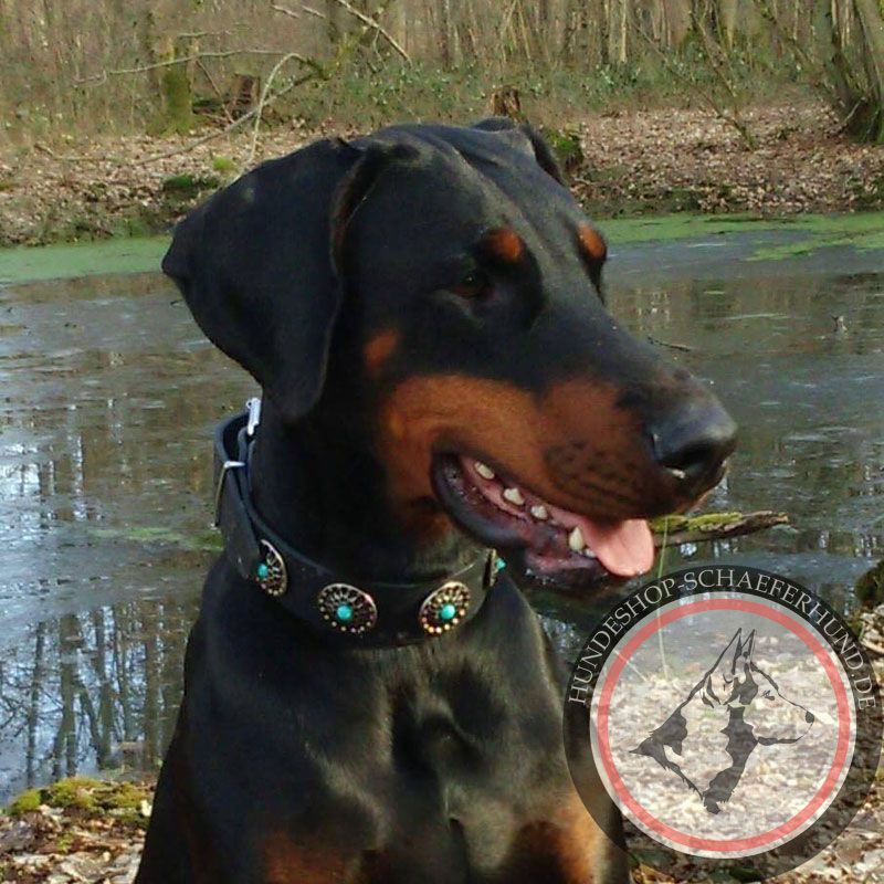 Einzigartiges und praktisches Hundehalsband Leder für Schäferhund hat bequemes und schönes Design. Es ist aus echtem durchgeöltem Leder gefertigt und mit metallischen Schildchen mit blauen Steinen dekoriert. Dank dem D-Ring für Hundeleine und Stahl-Beschlag ist das Erzeugnis sehr stark und sicher. Drei Farben und zahlreiche Größen sind möglich. Dieses Halsband ist abriebfest und dauerhaft.