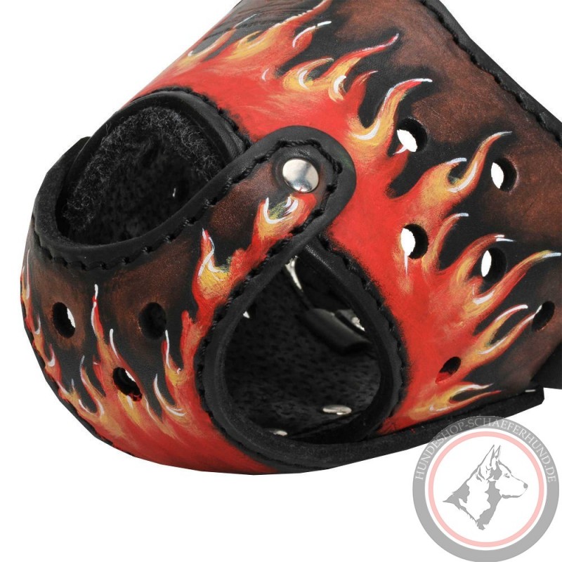 Hand painted tongues of fire on genuine leather. Classic muzzle with exclusive painting. Non-toxic and resistant to sunlight and water. The muzzle is stitched and riveted. Felt-lined. Well ventilated. Used for walking, training and service work. Your GSD or Belgian Malinois will look incredibly with this fiery muzzle!