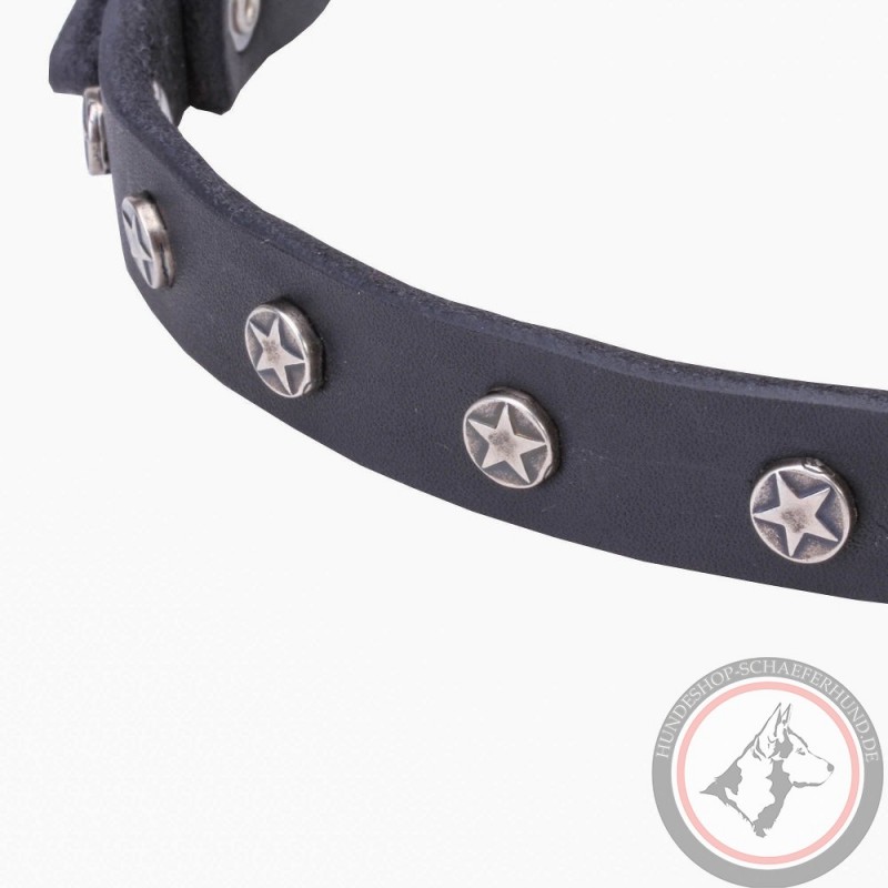 Pleasant to touch, durable and flexible collar for regular walking your young German Shepherd, Belgian Malinois or puppy. Very strong in spite of the width. Doesn't cut into the dog's neck because of rounded edges. Decorated with chrome-plated steel stars. Buckle and D-ring are also of steel with chrome plating. Exceptional comfort and safety.
